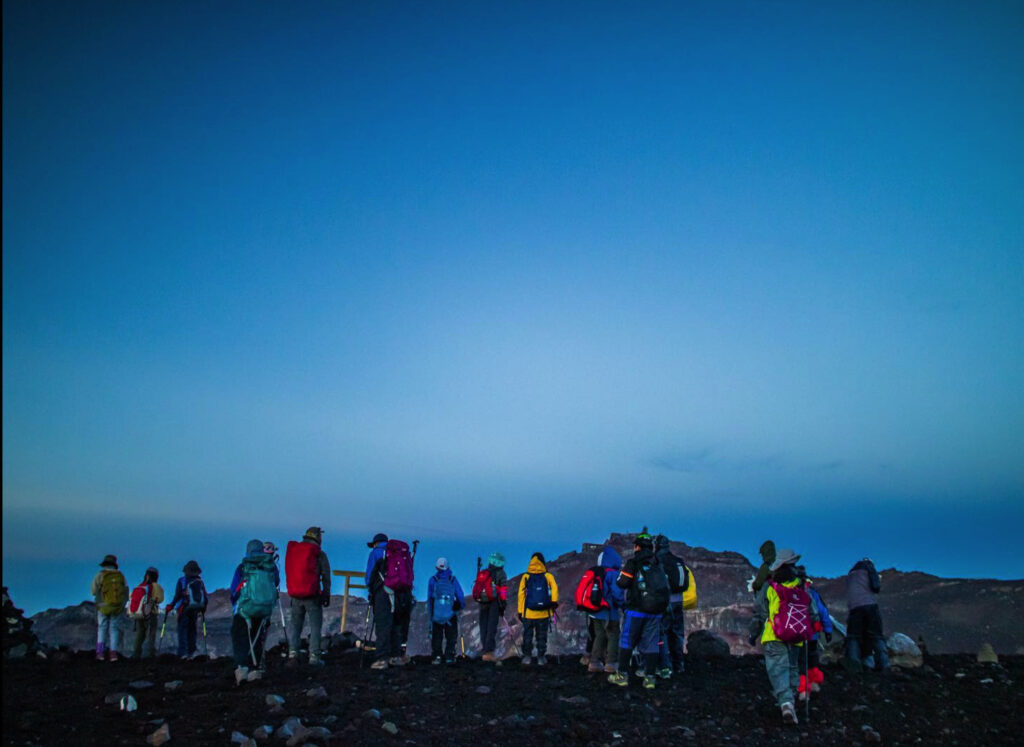 どのトレイルを歩こうかと期待を胸に集まる人。